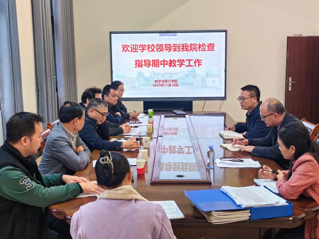 11月18日,学校党委常委、副校长刘永建带队到数学与统计学院开展2025-2026学年第一学期期中教学检查和指导工作,检查组成员先查阅了学院各项教学材档案材料及教学工作开展情况,随后在新民楼C315会议室召开检查指导反馈会。检查组成员和数学与统计学院领导班子以及教学秘书、教师代表参加反馈会。