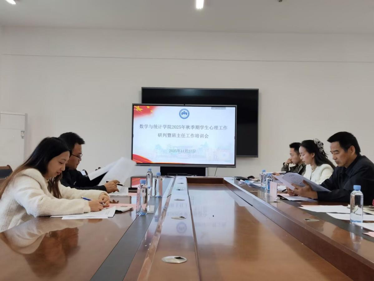 11月27日,数学与统计学院于我校东校区新民楼C408会议室召开2025年秋季学期学生心理工作研判暨班主任工作培训会。学校学生工作部(处)处(部)长杨潇、学院党委书记庞伟出席会议,心理健康教育中心教师吕梦瑶到会指导,学院全体班主任、辅导员参加会议。
